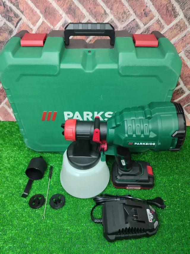 Detalles del productoPistola de pintar eléctrica Parkside con su maletín y accesorios.