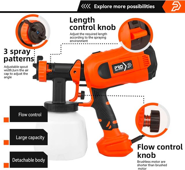 Detalles del productoPROSTORMER Pulverizador de Pintura, Alta Potencia de 750W con Flujo Máximo de 1L/Min, Gran Capacidad 1200ML, 4 Boquillas para la Pulverización y Limpieza del Bricolaje.