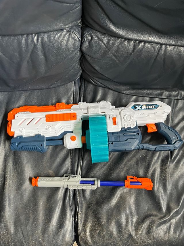 Detalles del productoSe vende un kit de pistola X-Shot con un tambor de color turquesa y un accesorio de pistola Nerf.