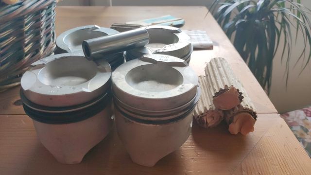 Pistones originales sin usar de antigua tienda de recambios, completos con bulones y segmentos.