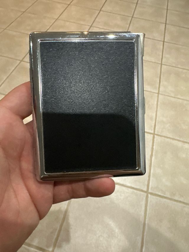 Elegante pitillera con acabado metálico y panel frontal negro. - Diseño rectangular. - Materiales resistentes.