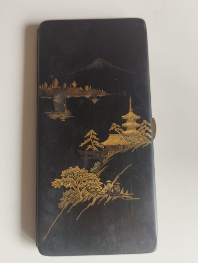 Detalles del productoAntigua pitillera con un diseño tradicional japonés en dorado sobre fondo negro. Presenta una escena paisajística con el Monte Fuji, pagodas y árboles.