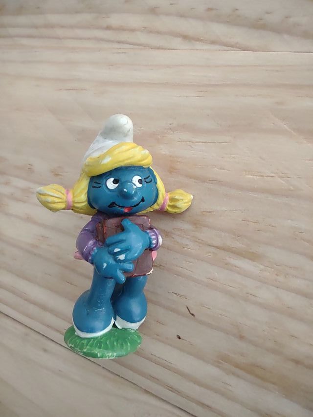 Detalles del productoFigura de plástico pvc de Pitufina con dos coletas y libro, como de colegiala, de los pitufos.