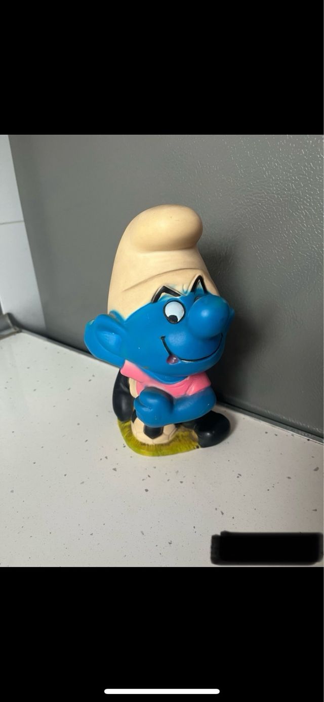 Figura de un pitufo, de goma, con un diseño antiguo. Es una pieza coleccionable. - Material: Goma - Color: Azul y beige - Diseño clásico de los Pitufos