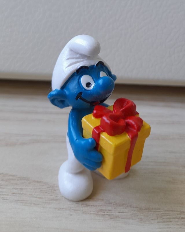 Detalles del productoFigura de un Pitufo sosteniendo una caja de regalo. Es una figura pequeña y encantadora, ideal para coleccionistas.