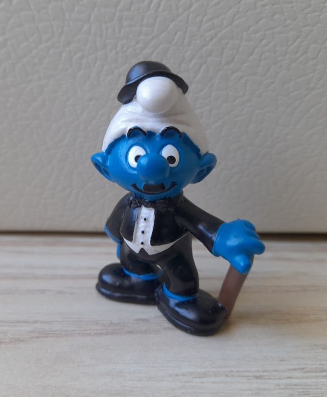 Figura de un pitufo Charlot. Lleva un elegante bombín y un bastón. - Figura de plástico. - Lleva bombín y bastón. - Ideal para coleccionistas.