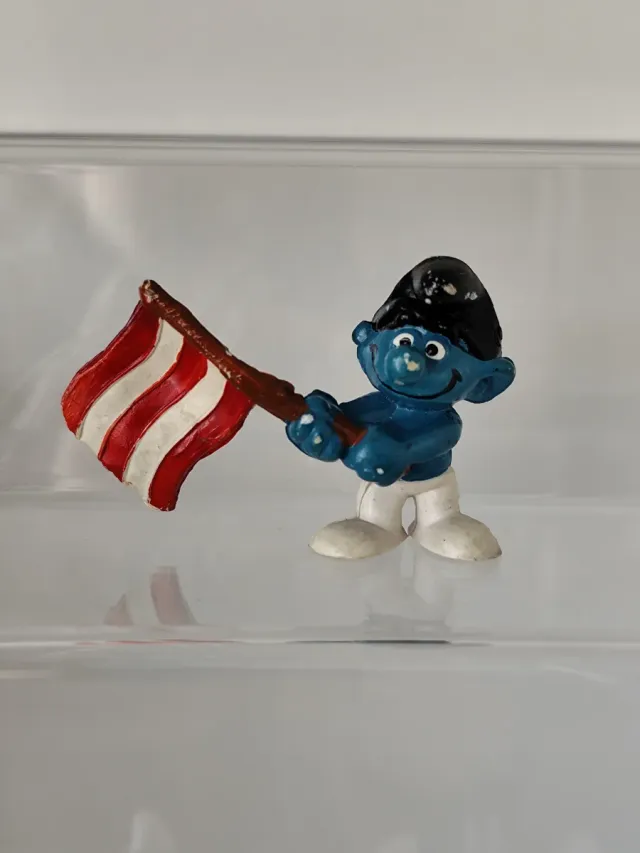 Figura de pitufo de PVC, un material no tóxico. Bootleg Español 🇪🇸 - Pitufo con una bandera. - Material: PVC.