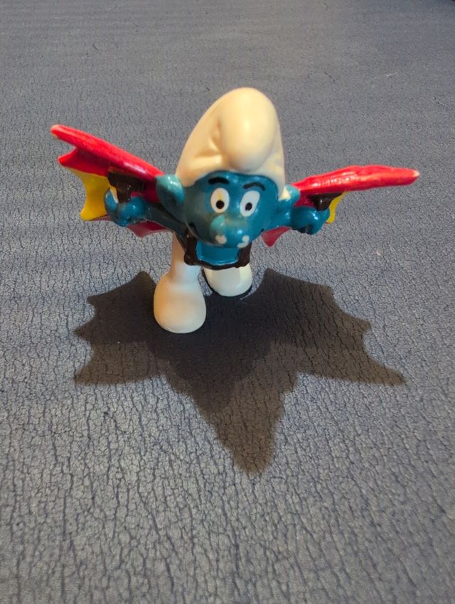 Figura de Pitufo con capa y alas. Años 80 - Color azul. - Capa roja y amarilla. - Alas rojas.