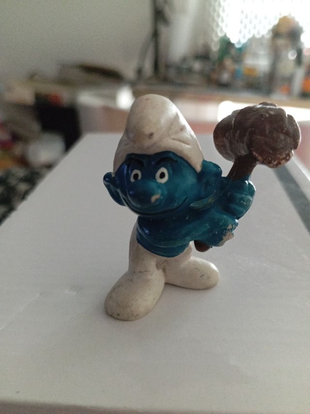 Detalles del productoFigura de colección de un Pitufo sosteniendo un martillo. Es una figura pequeña de plástico PVC. - Presenta un diseño clásico de los Pitufos. - El Pitufo lleva un gorro blanco. - El martillo es de color marrón oscuro. - La figura muestra señales de desgaste por el paso del tiempo.