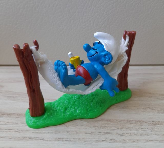 Detalles del productoFigura de Pitufo disfrutando de una hamaca. Es una pieza pequeña y encantadora, ideal para coleccionistas.