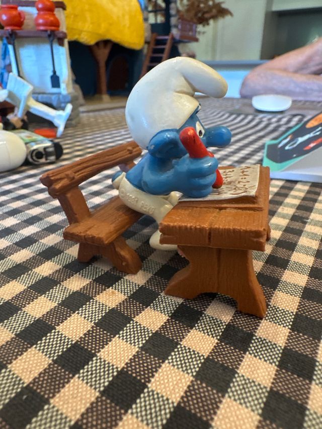 Detalles del productoFigura de Pitufo estudiante sentado en su pupitre, listo para aprender. Incluye un lápiz rojo.