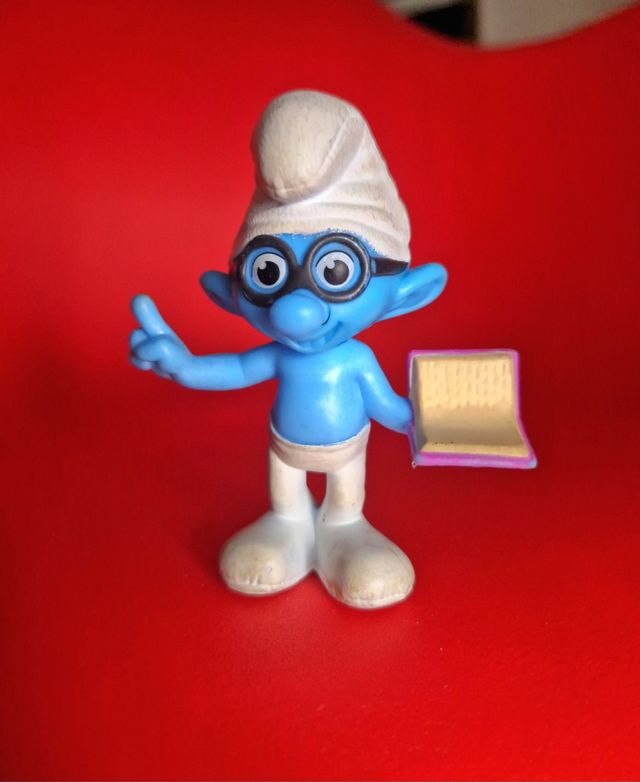 Figura de colección de un pitufo filósofo. Es una figura pequeña y encantadora, ideal para coleccionistas. Plástico blando. 2013. Peyo para McDonald's. Mide 8 cm.