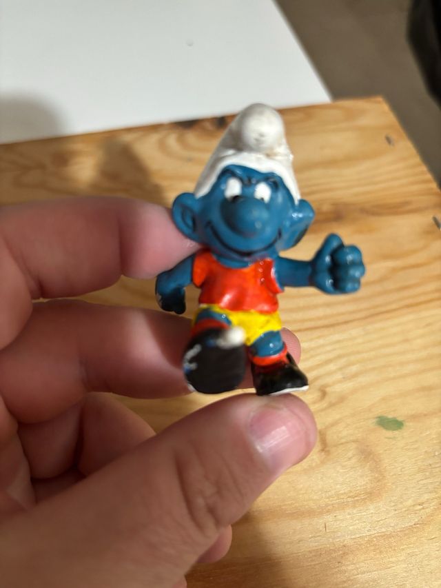 Detalles del productoFigura antigua de un Pitufo jugando al fútbol, hecha de PVC. Es una pieza coleccionable de la marca PEYO.