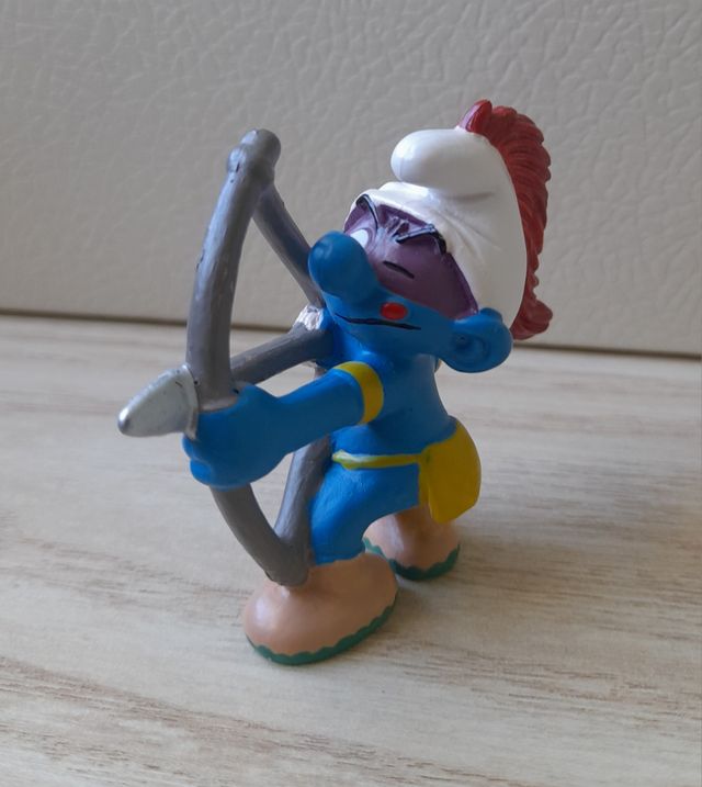 Figura de Pitufo indio con arco. Es una figura pequeña y colorida, ideal para coleccionistas. - Pitufo con arco y flecha. - Lleva un tocado. - Material: plástico.