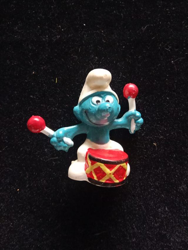 Detalles del productoFigura de Pitufo tocando el tambor. Fabricado por Scheich en Hongkong. Numerado con un 3.