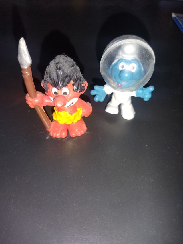 Dos figuras de Los Pitufos, en buen estado. - Un pitufo astronauta con traje espacial. - Un pitufo cavernícola con lanza.