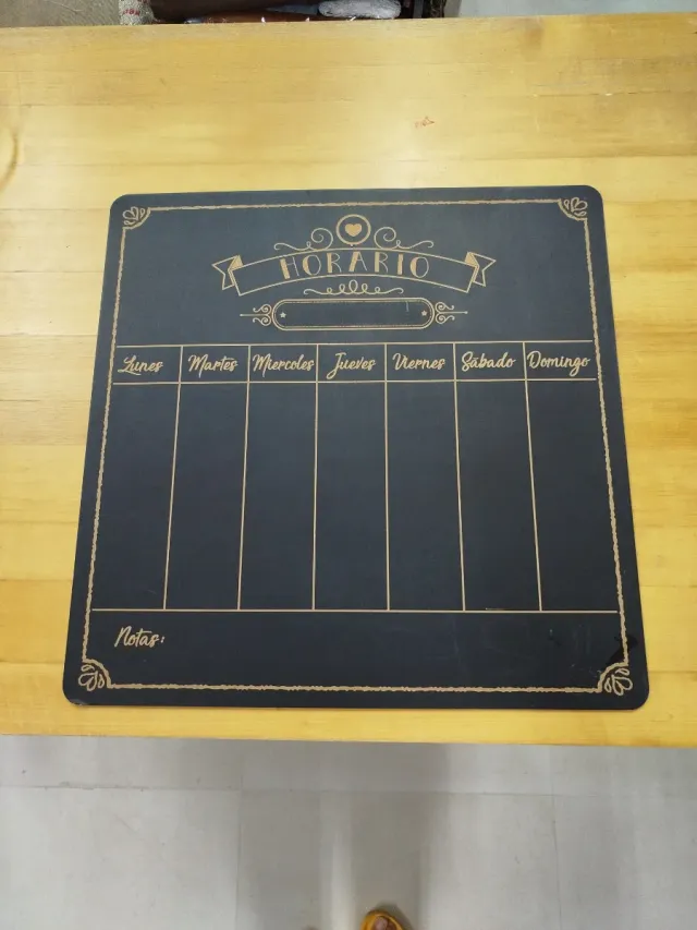 Detalles del productoPizarra negra con diseño de horario semanal.