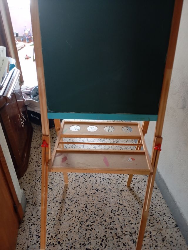 Detalles del productoPizarra infantil de madera con caballete. Ideal para niños y niñas. Está en buen estado, aunque presenta algunas marcas de uso en la superficie de madera.