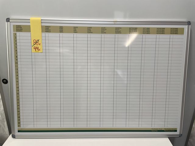Pizarra para planificación anual. medidas: 93x63 - Formato de calendario. - Meses en varios idiomas (español, inglés, francés, portugués). - Espacio para 31 días.