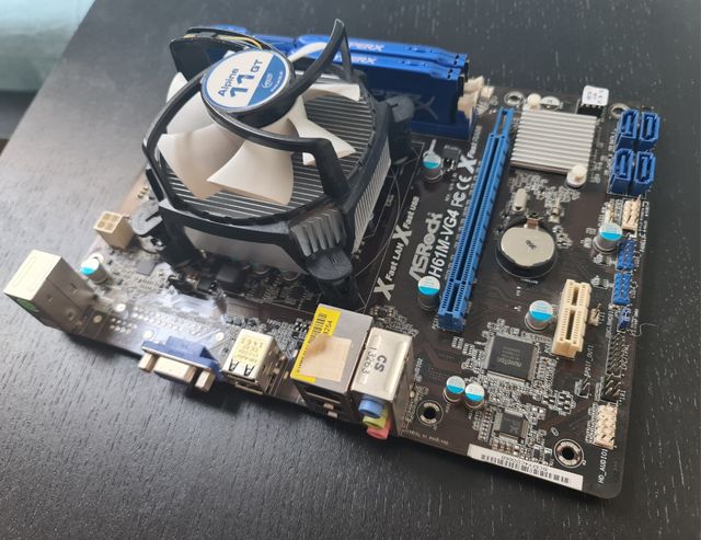 Detalles del productoVendo placa base ASRock H61M-VG4 en buen estado. Incluye un procesador y dos módulos de memoria RAM.