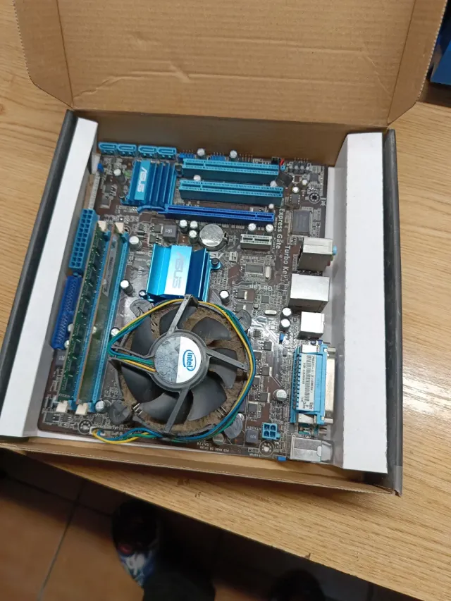 Detalles del productoConjunto de placa base, memoria RAM y procesador de la marca ASUS.