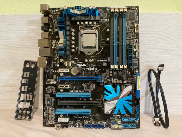 Placa Base ASUS P7P55D-E con un i5 750 sin el disipador, un cable SATAIII y su escudo metálico. Funciona perfectamente. -Socket 1156 -Perfecto para overclock