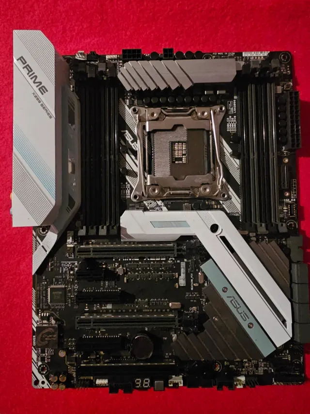 Placa base ASUS PRIME X299 Series. - Diseño elegante en blanco y gris. - Múltiples ranuras para expansión. - Conectores de alimentación robustos.
