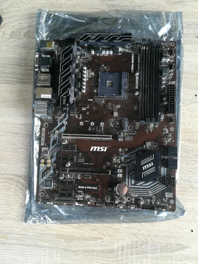 Placa base MSI B450-A PRO MAX. - Diseño en color marrón. - Soporte para DDR4 Boost. - Incluye disipador de calor negro con logo MSI.sin chapita trasera
