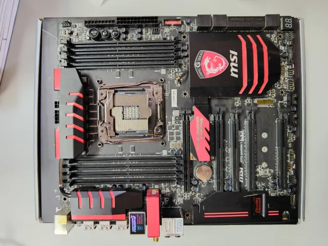 Placa base MSI X99S Gaming. - Diseño con disipadores en negro y rojo. - Soporte para memoria DDR4. - Múltiples ranuras de expansión PCIe.