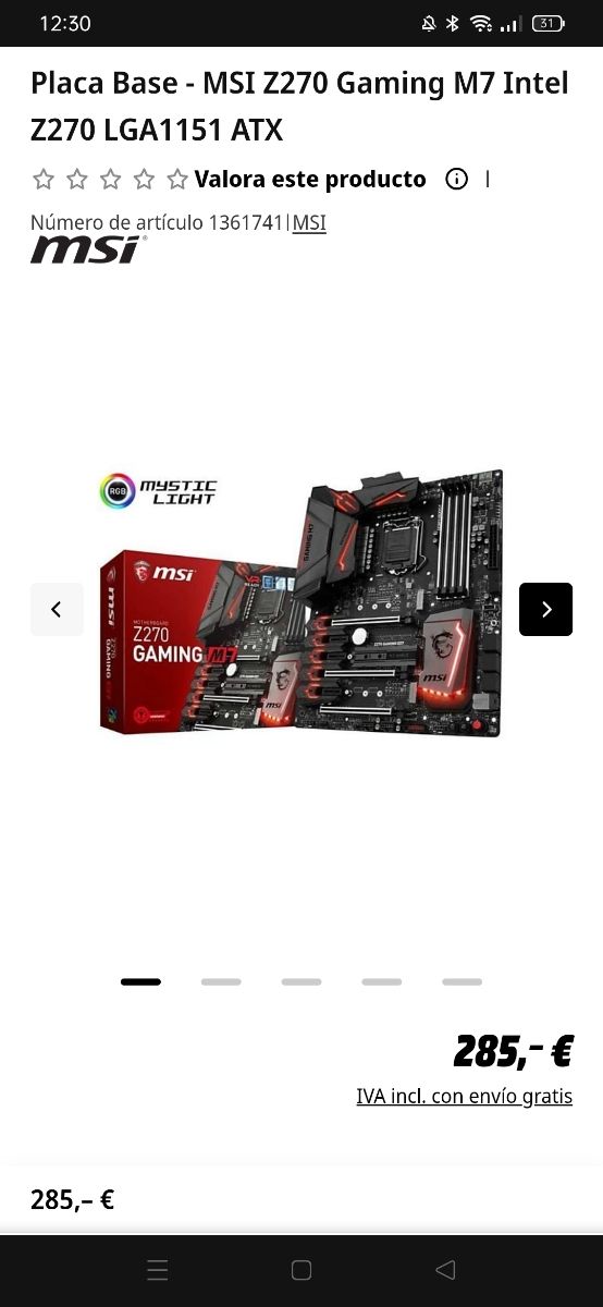 Detalles del productoPlaca base MSI Z270 Gaming M7 en perfecto estado junto con CPU Intel i5 7600K también en perfecto estado.