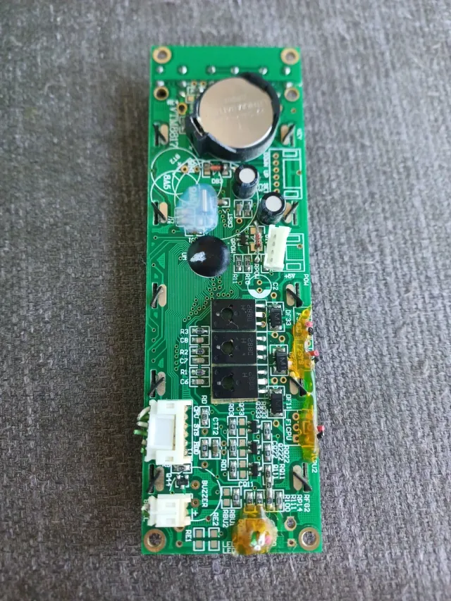 - Componentes visibles: batería tipo botón, transistores, condensadores y conectores.