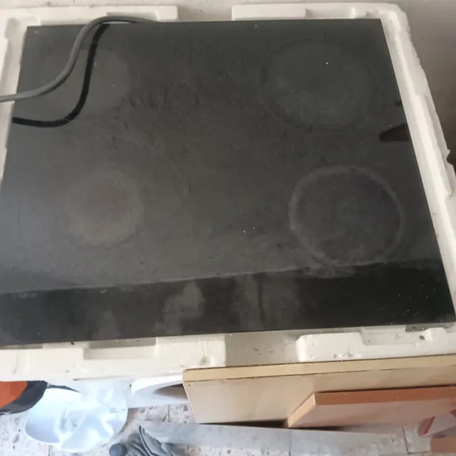 Placa de cocina negra con cuatro zonas de calor. - Superficie lisa y fácil de limpiar. - Diseño moderno y elegante.