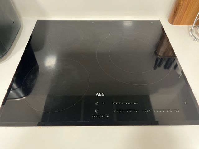 Placa de inducción AEG con superficie de cristal negro. - Cuatro zonas de cocción. - Controles táctiles. - Indicador de calor residual.