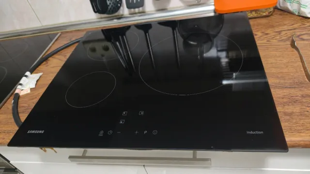 Placa de inducción Samsung de cristal negro.