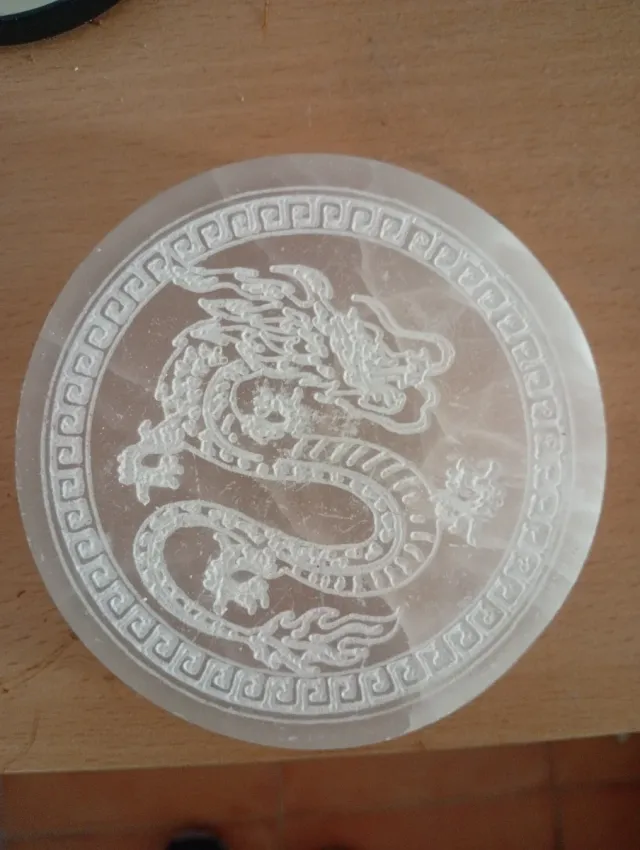 Placa decorativa de selenita con un diseño de dragón grabado. - Material: Selenita. - Diseño: Dragón. - Borde decorativo con greca.
