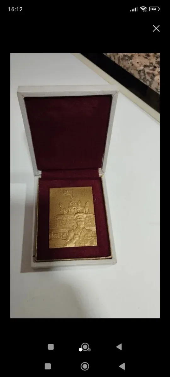 Detalles del productoPlaca conmemorativa dorada de la época soviética, presentada en su caja original.