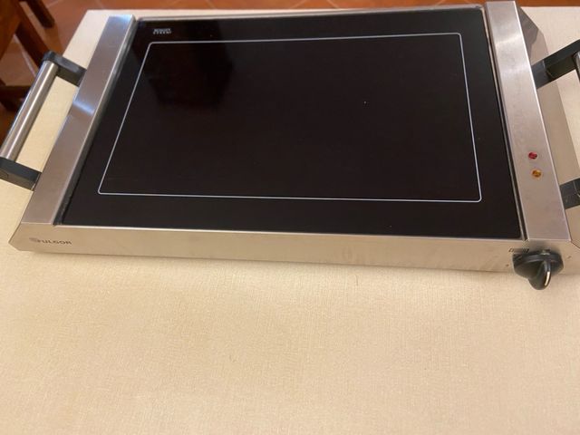 Detalles del productoPlaca eléctrica con superficie de cristal negro y asas de acero inoxidable. Ideal para asar alimentos.