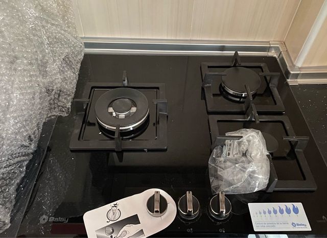 Detalles del productoCocina a gas Balay de tres quemadores, modelo 3ETG663HN. Está impecable, lista para instalar.