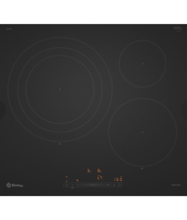 Placa de inducción Balay con tres zonas de cocción. - Diseño moderno en cristal negro. - Controles táctiles intuitivos. - Indicador digital de potencia.