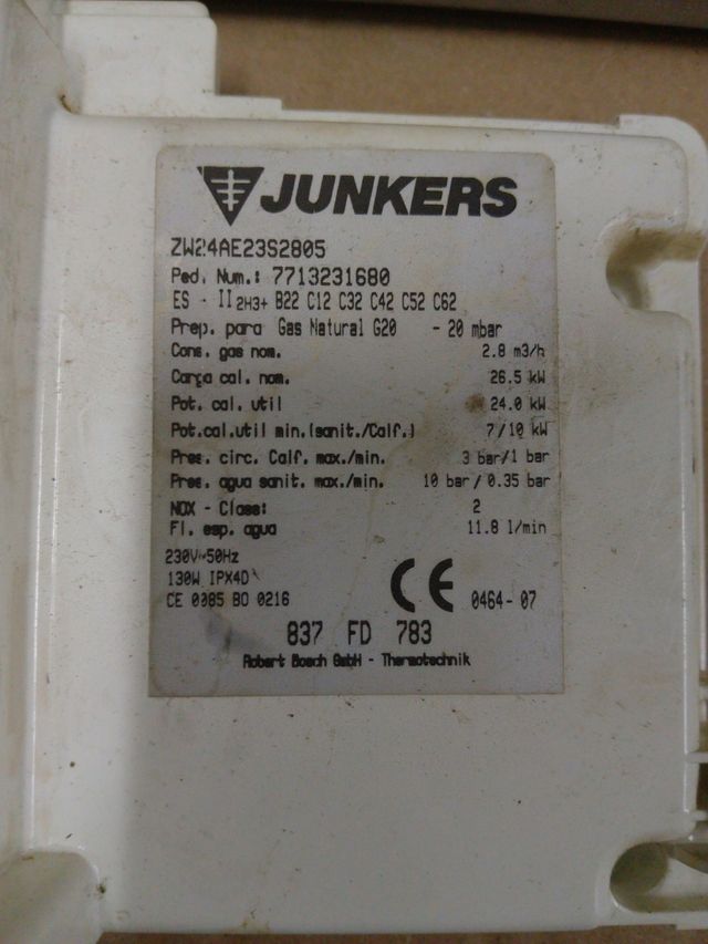 Placa electrónica para caldera Junkers en buen estado. - Modelo: ZW24AE23S2805 - Número de pedido: 7713231680 - Gas natural G20 - Potencia calorífica útil: 24.0 kW