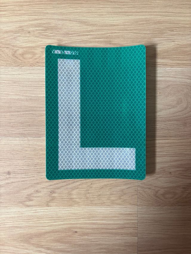Placa reflectante con la letra L sobre fondo verde. - Diseño con patrón de rombos. - Borde blanco.