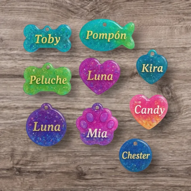 - Forma: hueso, hueso con huella, chapa, pez, corazón, círculo, huella, gato o su inicial