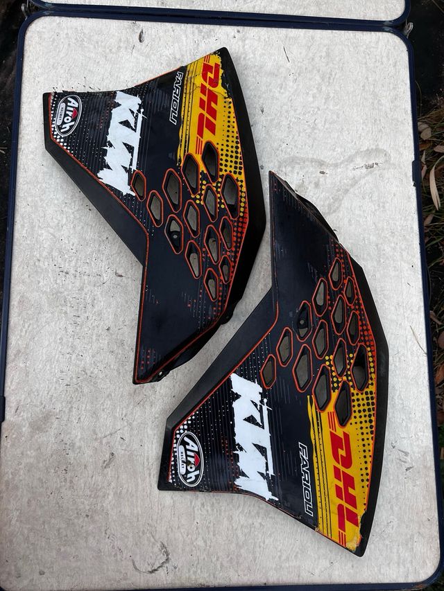 Placas laterales ktm exc 2008 usadas, no hay nada roto, las pegatinas estan algo levantadas y tienen alguna que otra rascada ( Valido para salir del paso o para lo que quiera el comprador ).