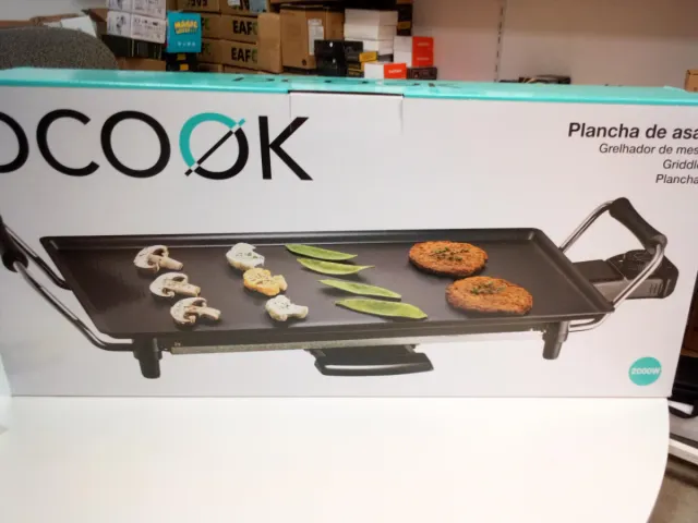 Detalles del productoPlancha de asar eléctrica de la marca COCOOK, ideal para preparar comidas a la parrilla en casa. Su diseño es moderno y funcional.