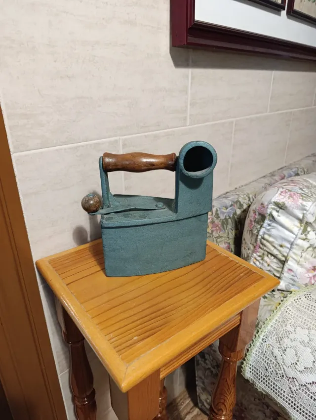 Plancha de carbón antigua con mango de madera. - Material: Hierro fundido. - Color: Verde. - Mango: Madera.