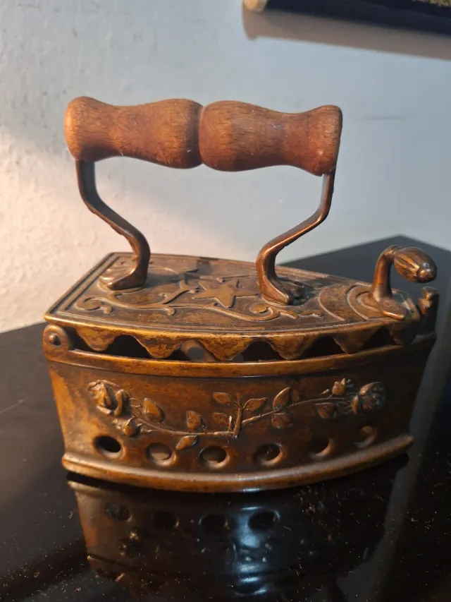 Pieza decorativa antigua con forma de plancha de carbón. - Diseño con motivos florales. - Fabricada en madera. - Asa de madera.