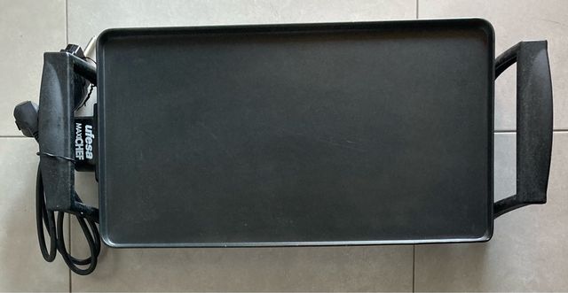 Detalles del productoPlancha eléctrica de cocina Ufesa MaxiChef de color negro. Dispone de asas laterales para facilitar el transporte. Medidas: 47 (largo) x 26 (ancho) x 5 (alto) cm.