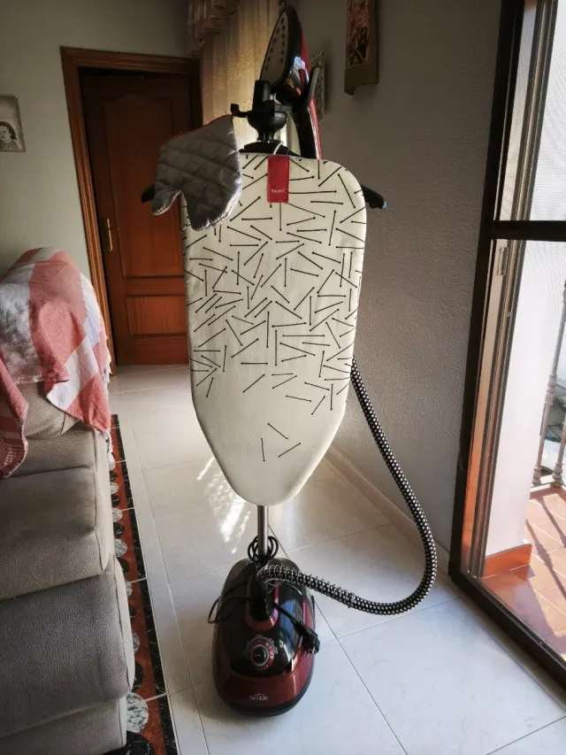 Detalles del productoPlancha de ropa vertical con base y accesorios.