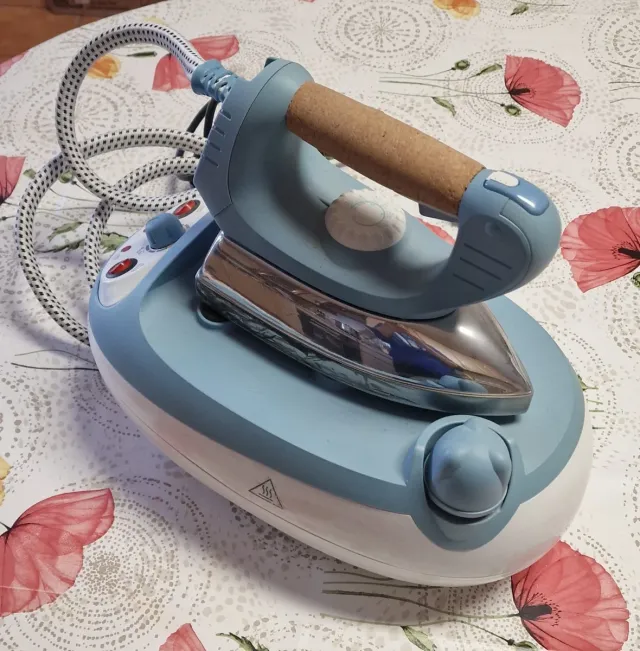 Detalles del productoPlancha de vapor con base azul claro y blanco. El asa tiene un acabado de corcho.