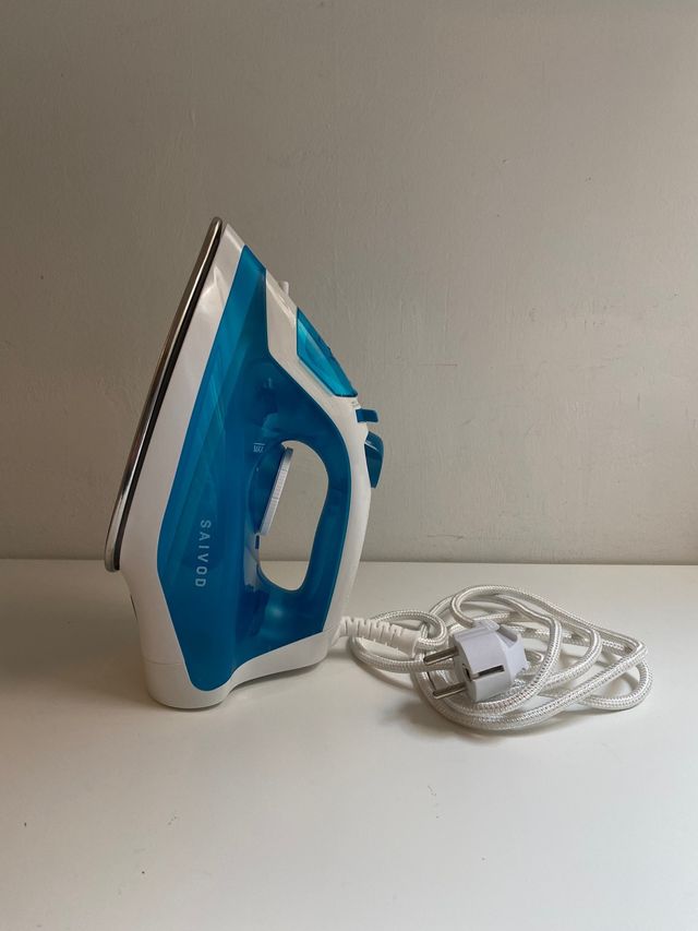 Plancha de ropa Saivod en color blanco y azul. - Base de planchado. - Depósito de agua. - Mango ergonómico. - Cable de alimentación.
